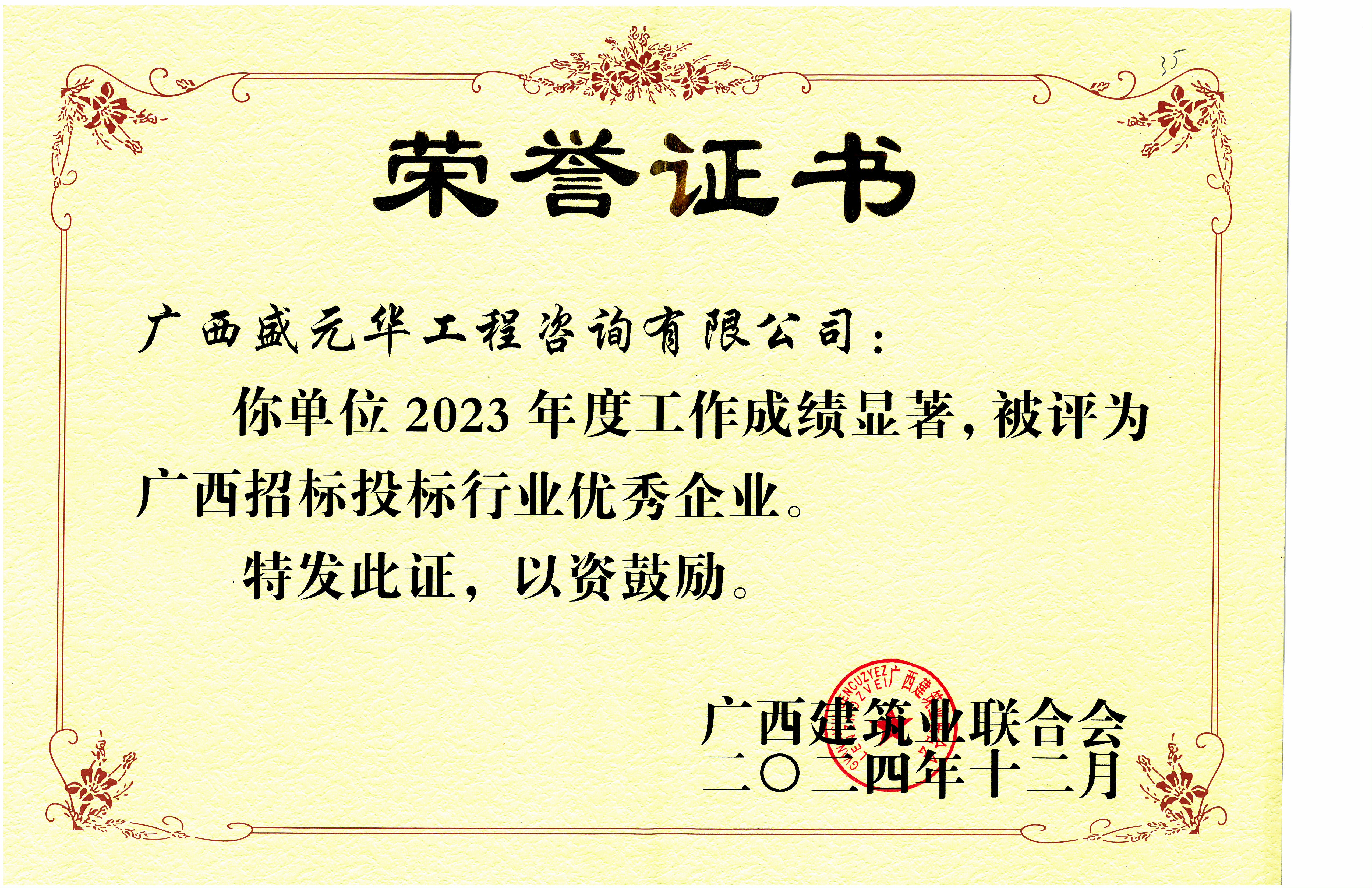 | 廣西盛元華工程咨詢有限公司獲評廣西建筑業(yè)聯(lián)合會2023年度廣西招投標行業(yè)優(yōu)秀企業(yè) |
